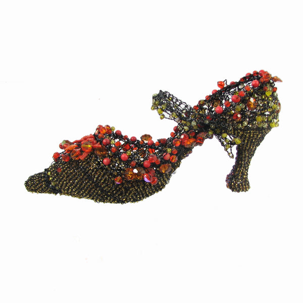 A pair of magical fantasy court shoes which have been sculpted by hand using bohemian glass, Swarovski crystals,Victorian Coral pieces and knitted together with wire would look fabulous placed on top of a coffee table.