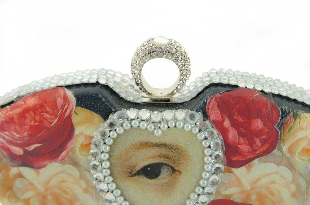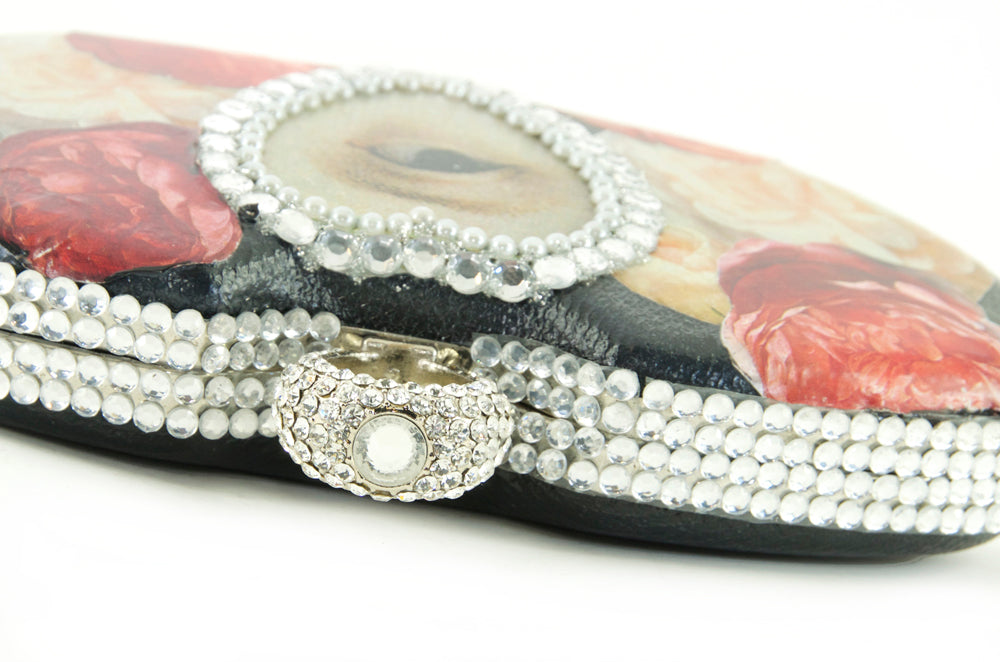 Intricate hand paper cut work has been carefully chosen using paper decoupage pictures, used to build stories on Victorian screens that were displayed in every English Victorian home. Beautiful open roses, hands holding posies, beautiful antique images of women, Cameos, portrait miniatures and my favourite subject of secret lovers eyes only known to the receiver. Every evening purse has been hand crafted and therefore is one -of - a- kind and is large enough to hold your mobile phone and essentials. A beautiful gift for a woman who has everything......