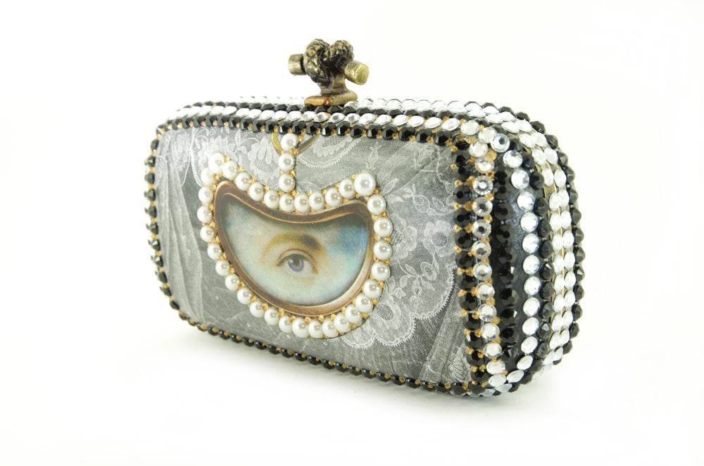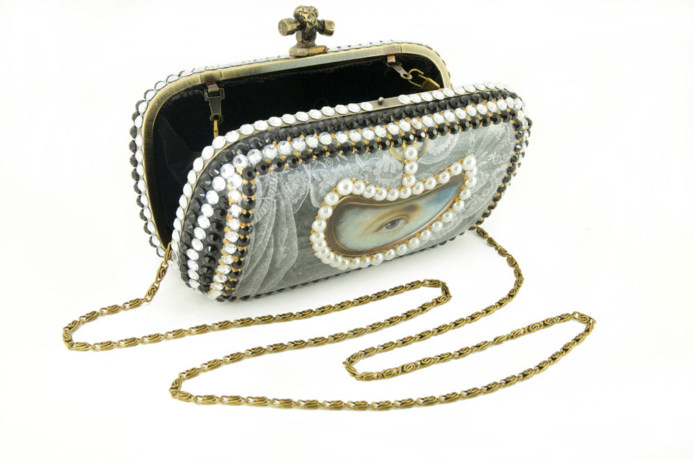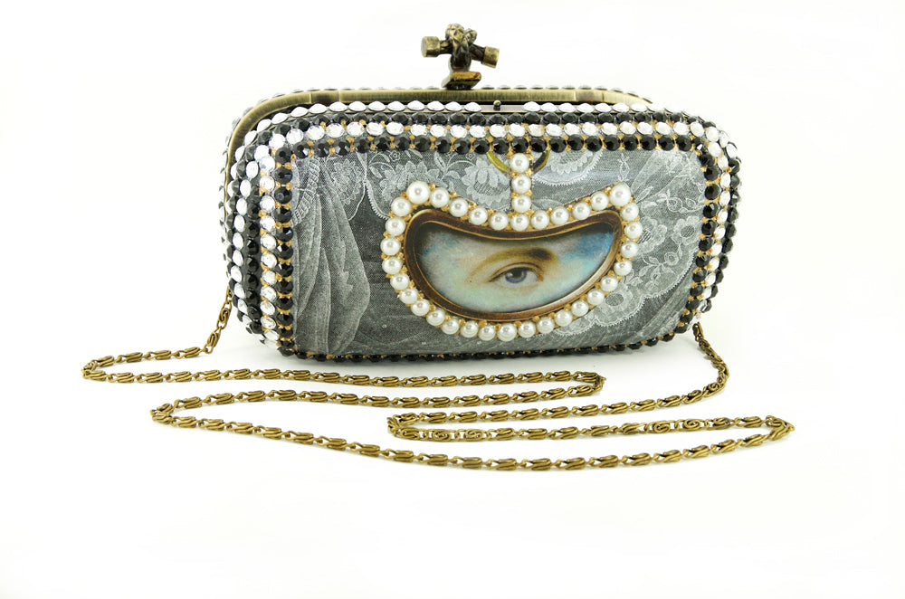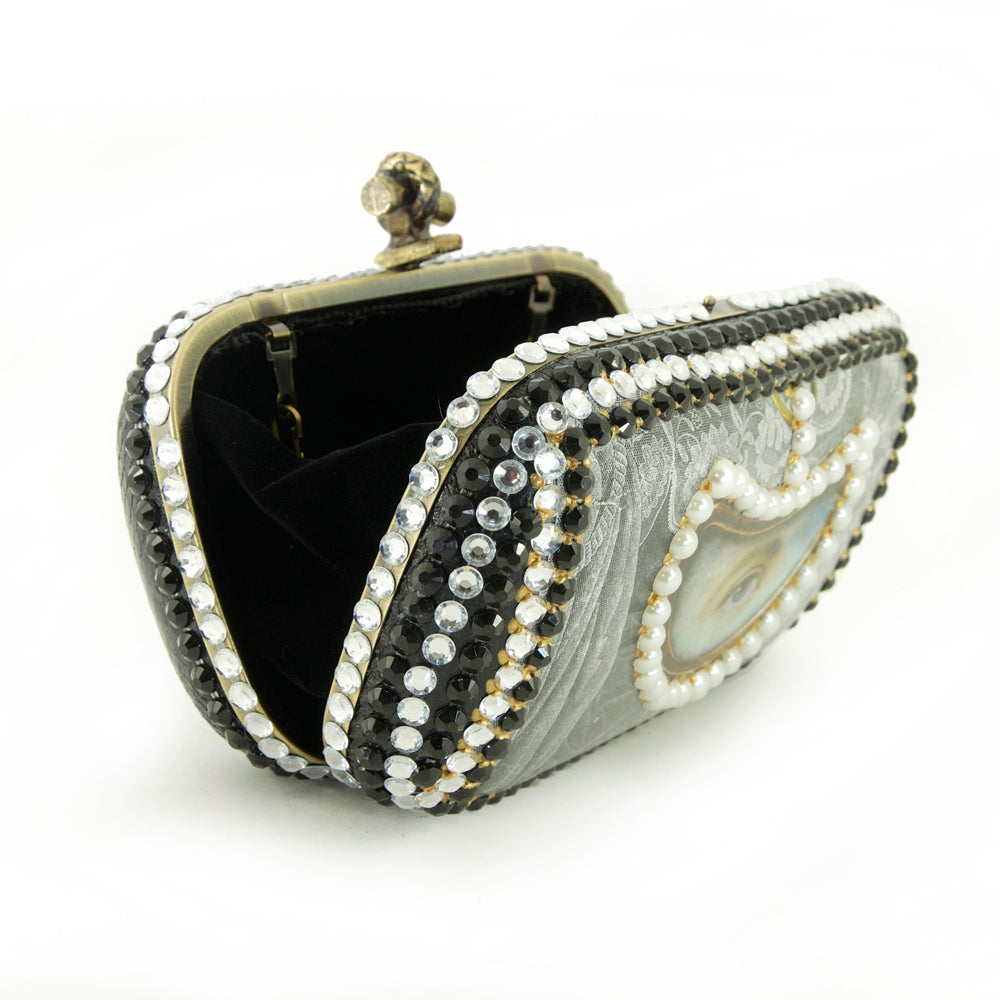 Intricate hand paper cut work has been carefully chosen using paper decoupage pictures, used to build stories on Victorian screens that were displayed in every English Victorian home. Beautiful open roses, hands holding posies, beautiful antique images of women, Cameos, portrait miniatures and my favourite subject of secret lovers eyes only known to the receiver. Every evening purse has been hand crafted and therefore is one -of - a- kind and is large enough to hold your mobile phone and essentials. A beautiful gift for a woman who has everything......