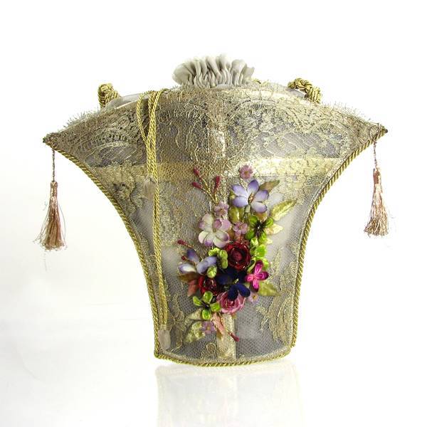 It has been constructed using a boned crin structure, covered in a gold Chantilly lace, and then embellished with tiny silk and velvet frosted flowers to create Basia Zarzycka’s signature “English Floral Garden” both on the front and back of this basket handbag.