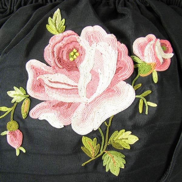 French Japanese style Bakelite frame evening bag with chain stitch shaded embroidery of large tubor roses and foliage on faille silk. Push button opening fabulous colours.