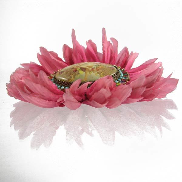 Hand-tooled Silk Chrysanthemum, beaded Cameo Brooch