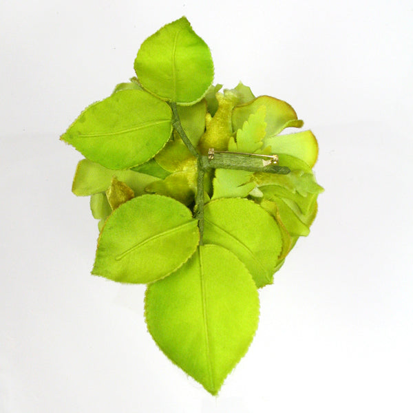 Small kimono rose created from fabric and mounted onto a chevile wrapped brooch.