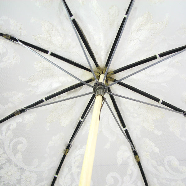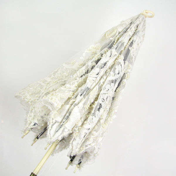 Antique ivory collapsible parasol frame circa 1840, which can be tiled at the top of the frame and angled like a fan, or folded in half by pushing a movable casing. This parasol has been recovered,using the original pattern, with a beautiful French beaded lace, from our bridal collection.