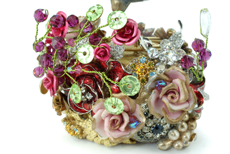 Although she has one or two samples in her shop, they are made to order and can take up to six weeks to produce, using vintage finds and an assortment of jewels that Basia has collected over the years to use in her creative designs.
