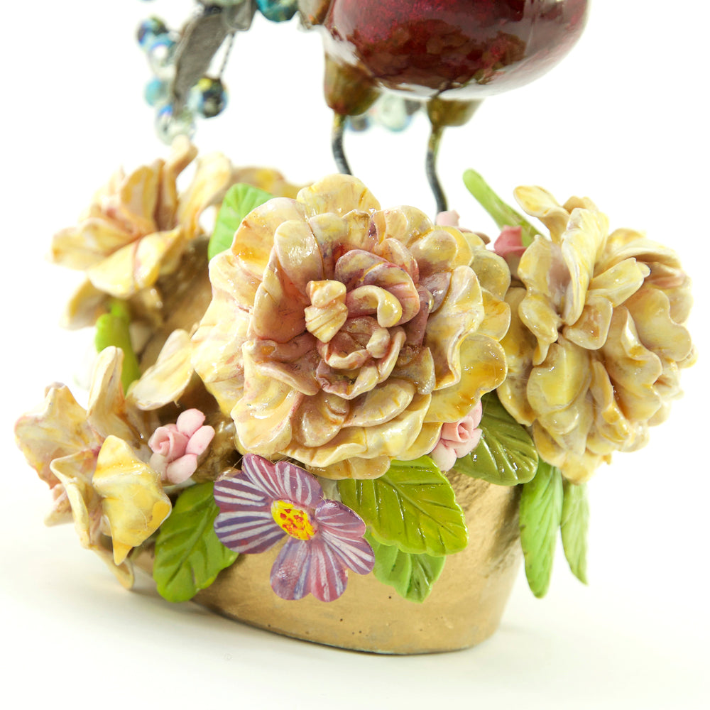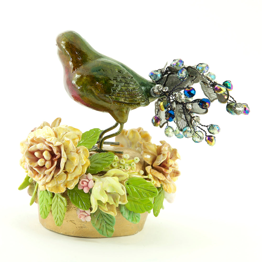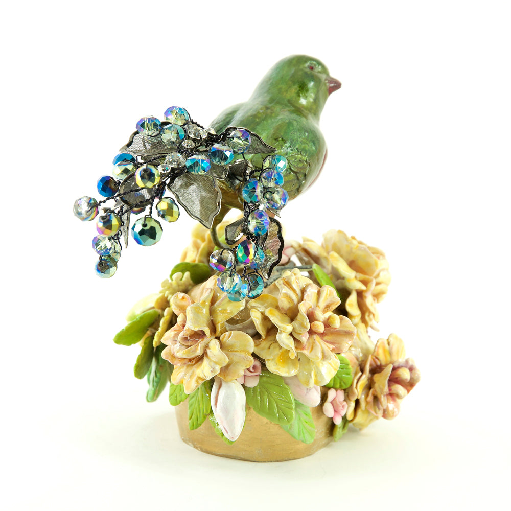 I love creating these colourful, magical, jewelled singing birds. I have hand-painted their feathers and beaks with cold enamels and added adornments of vintage jewellery, gorgeous crystals and interesting findings discovered on my travels to flea markets around London, Paris, Belgium and Krakow. These one-of-a-kind singing birds are part of my range of special edition collectable items and are tagged with my exclusive Basia Zarzycka gold label.