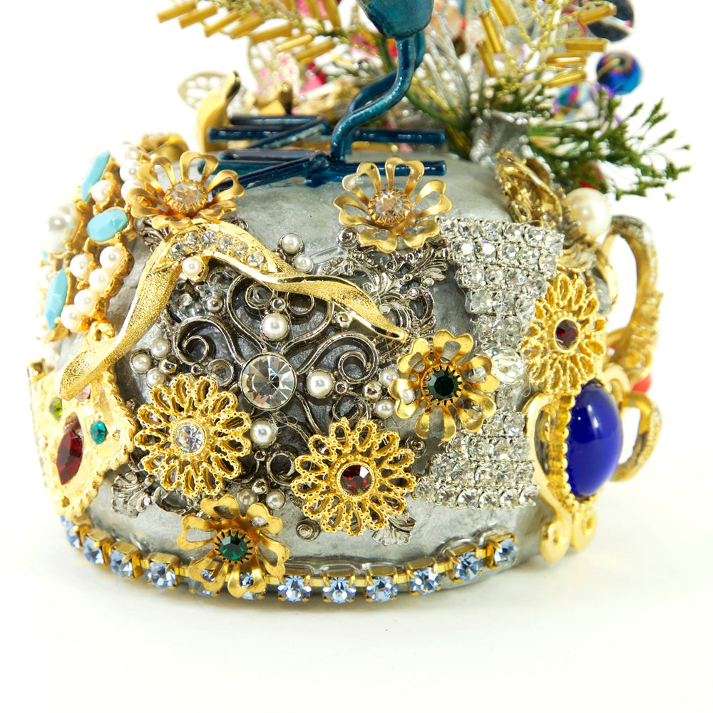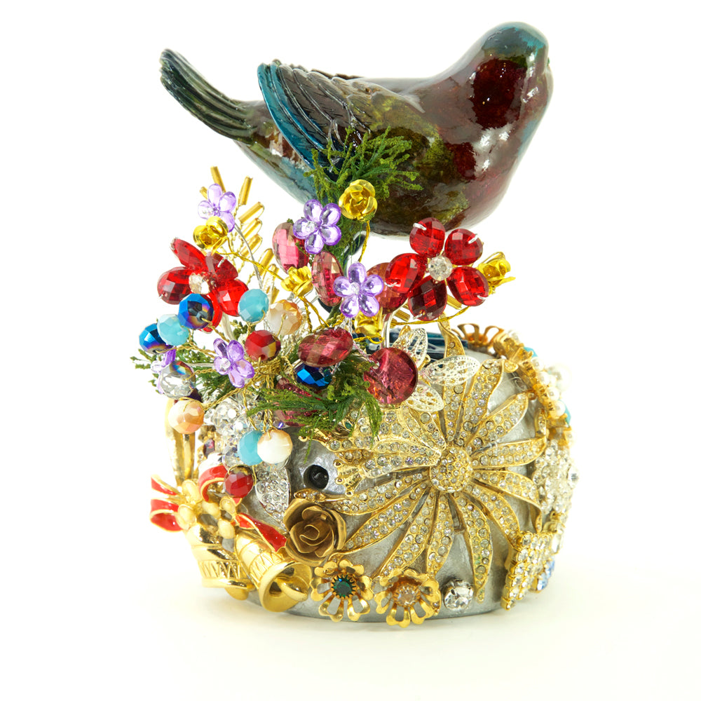I love creating these colourful, magical, jewelled singing birds. I have hand-painted their feathers and beaks with cold enamels and added adornments of vintage jewellery, gorgeous crystals and interesting findings discovered on my travels to flea markets around London, Paris, Belgium and Krakow. These one-of-a-kind singing birds are part of my range of special edition collectable items and are tagged with my exclusive Basia Zarzycka gold label.