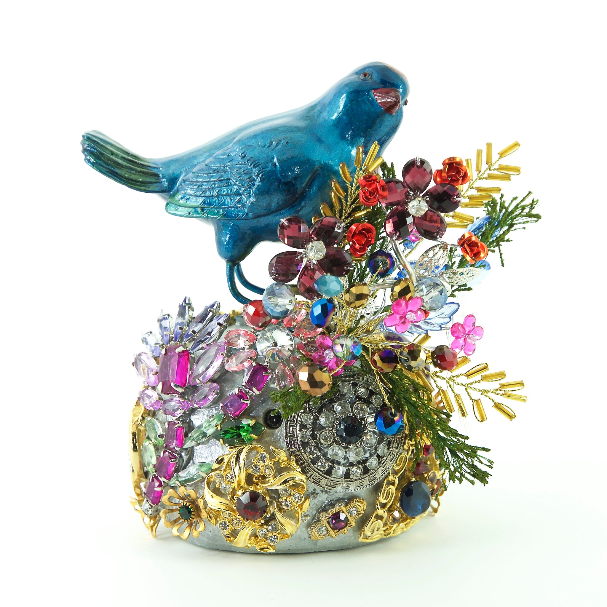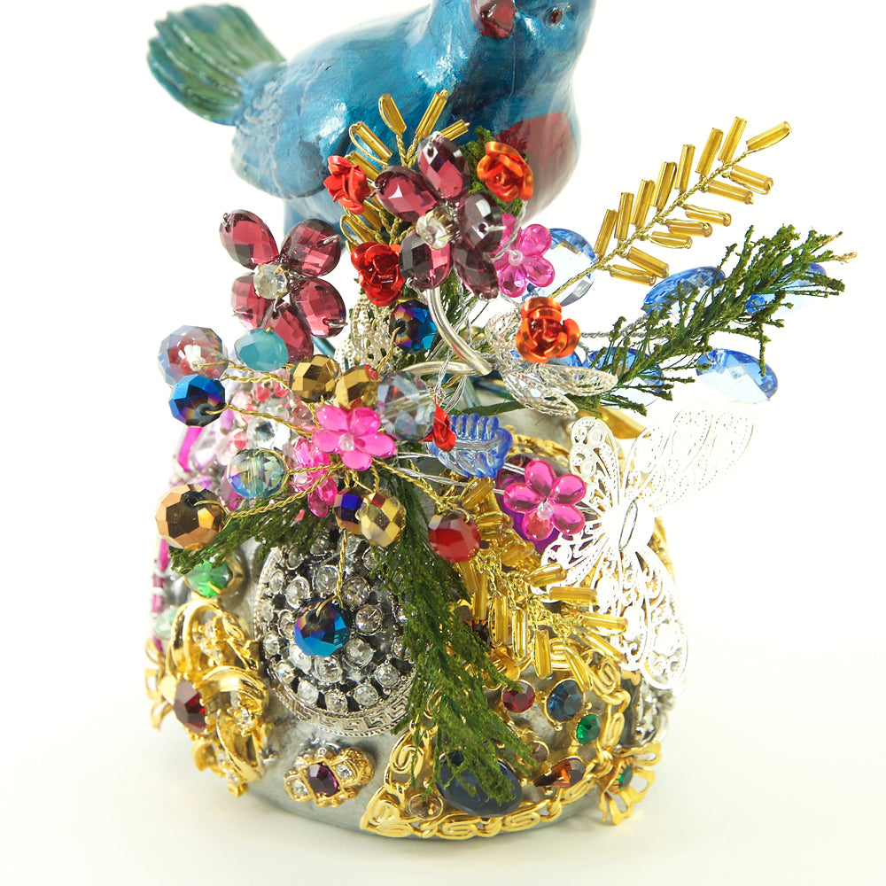 I love creating these colourful, magical, jewelled singing birds. I have hand-painted their feathers and beaks with cold enamels and added adornments of vintage jewellery, gorgeous crystals and interesting findings discovered on my travels to flea markets around London, Paris, Belgium and Krakow. These one-of-a-kind singing birds are part of my range of special edition collectable items and are tagged with my exclusive Basia Zarzycka gold label.
