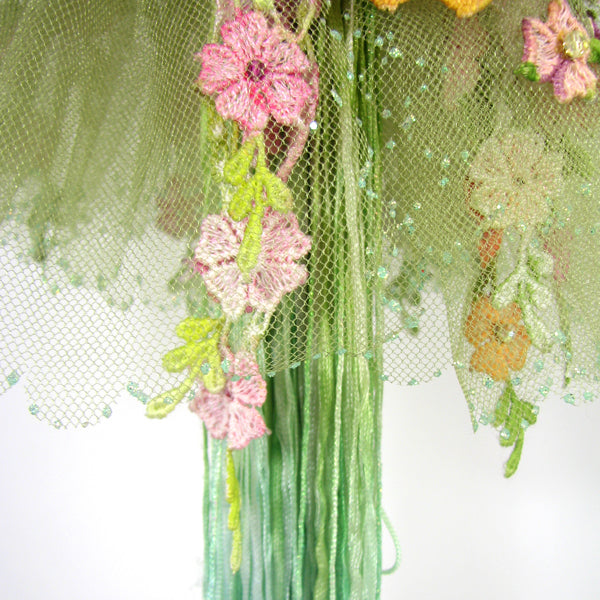 This 1920''s inspired, hand created and painted half doll, dressed in a full green tulle skirt adorned with guipure lace flowers, Swarovski crystals and tooled rose buds & forget-me-nots, supporting a hand dyed fringe ribbon tassel, suspended on a silver metallic rope.