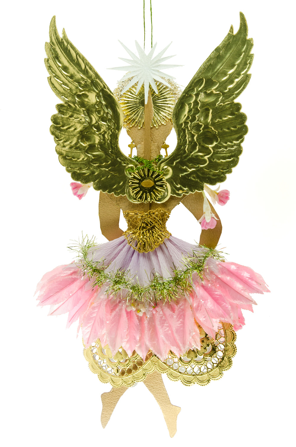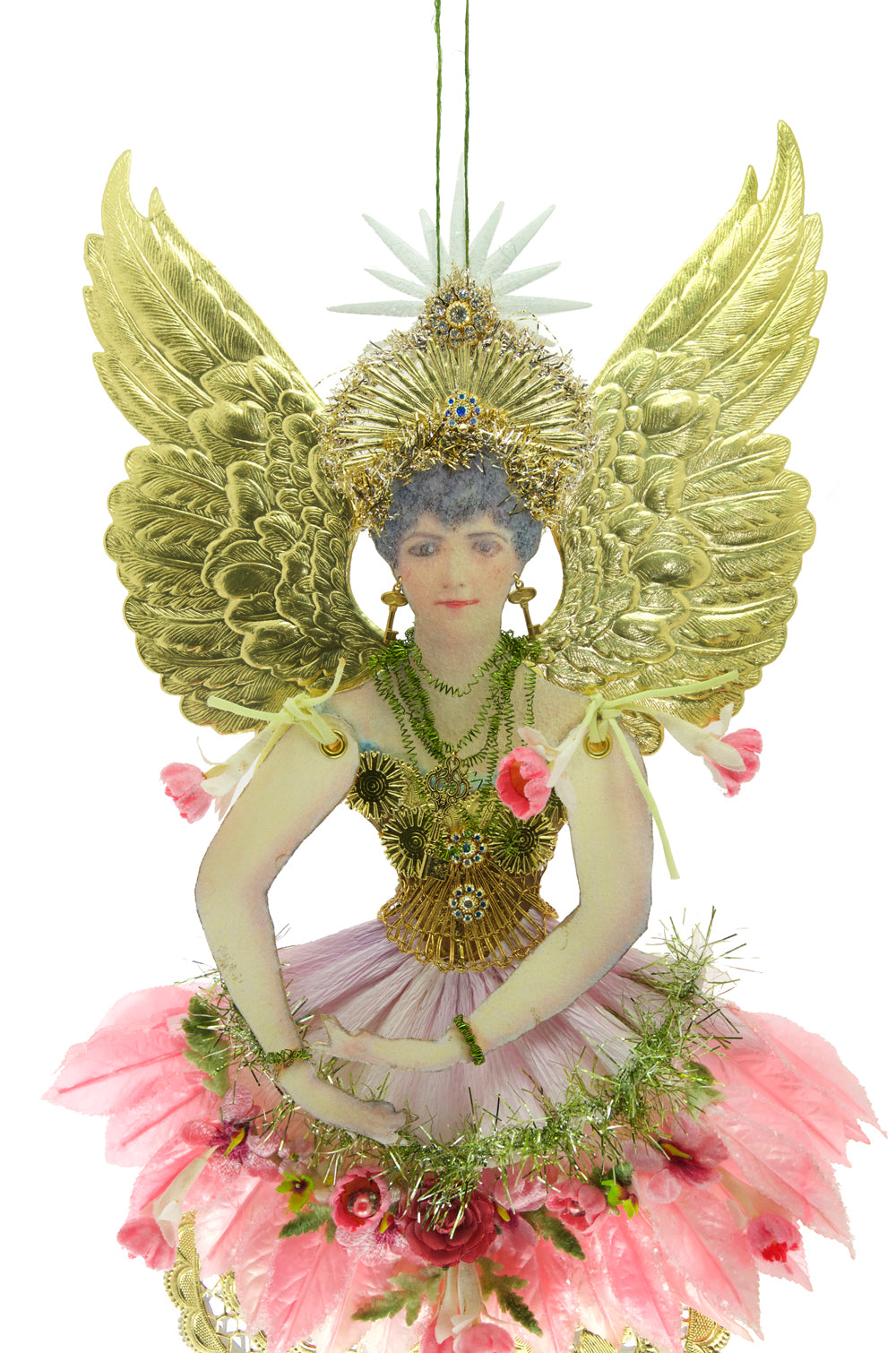 Ethereal angels and faries have been finely created from paper, with incredible detail using vintage tinsel and unusual adornments, Dresden embellishments and wonderful small antique flowers and findings I source from flea markets in Brimfield U.S.A., Paris, Belgium and Krakow. I have embellished the fantasy fairies paper crepe gowns, with beautiful vintage celluloid leaves I found in Lille Braderie this autumn and amazing treasures on each and every piece from tiara to toe. Every fairy is one-of-a-kind and part of 'The Special Edition' range hand made by Basia and tagged with a gold Basia Zarzycka label. These unusual ornate fairies are made in two sizes and are sold on a first come Basis as no two fairies are alike.