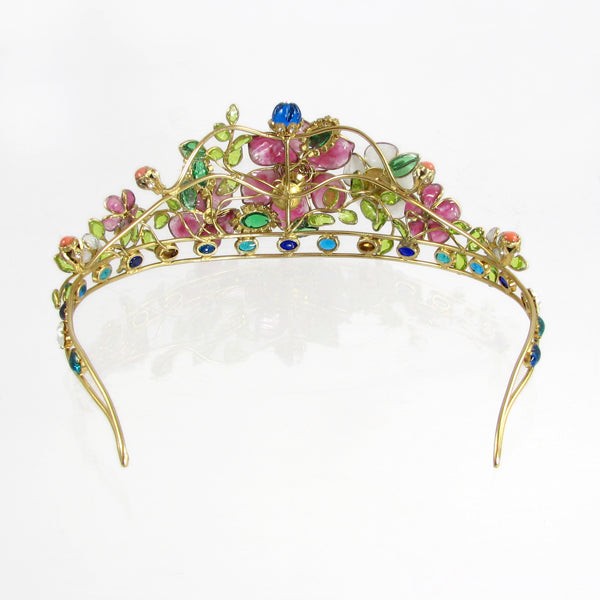 This unusual Maison Gripoix style gold plated brass wire frame tiara, with Pâté-de-verre petals and leaves, and cabochons surrounded with clear crystal rhinestones, created in both subtle and vibrant coloures of varying degrees of trans lucency and opacity.