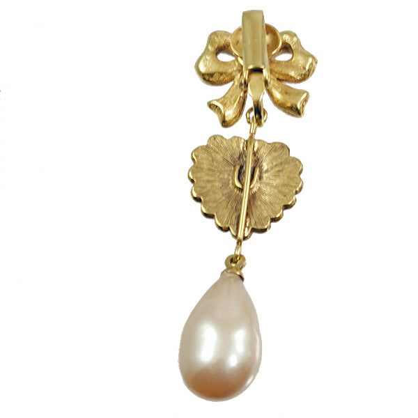 Stylised dainty ribbon bow and heart clip on earrings, set with faux seed pearls and suspending a faux pearl drop.