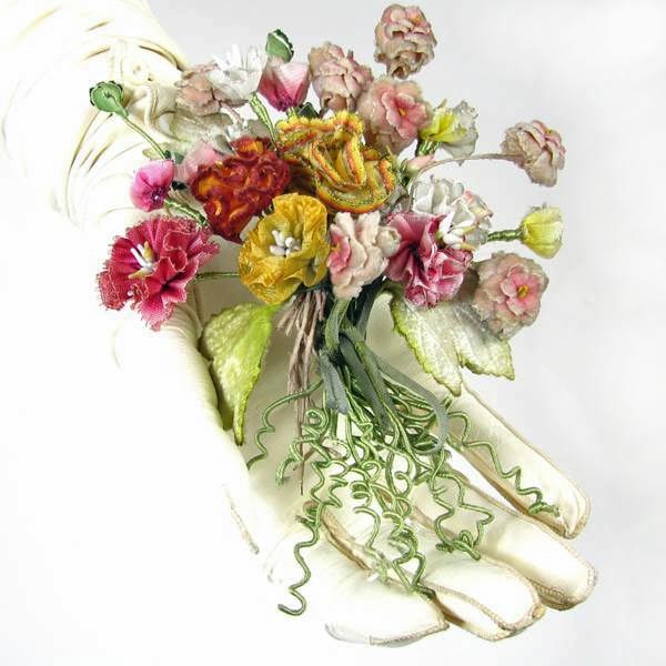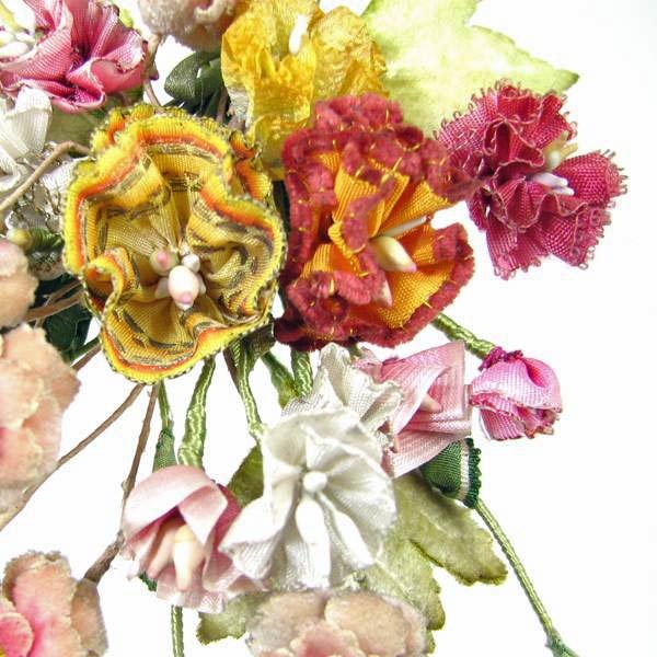 Influenced by the early 1800,s delicately hand stitched ribbon work corsage has been created with original French antique shaded silk ribbons. Collected by Basia Zarzycka all over the world these rare and hard to find ribbons, are carefully gathered and hard to find ribbons, are carefully gathered and stitched around antique stamens, and bunched together and arranged into these very special posies which can be pinned in your hair or worn as a corsage. 16 x 11cm
