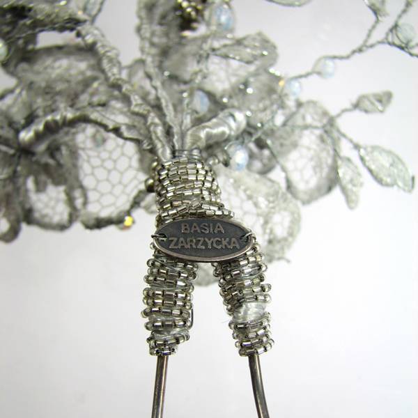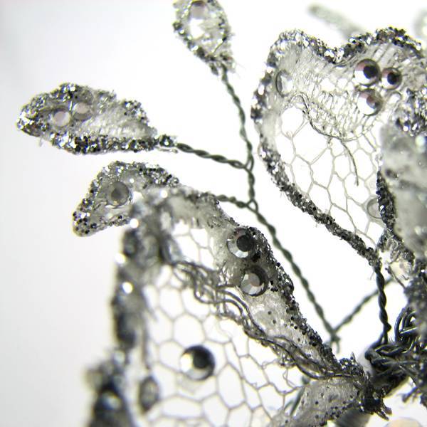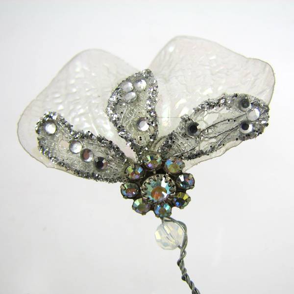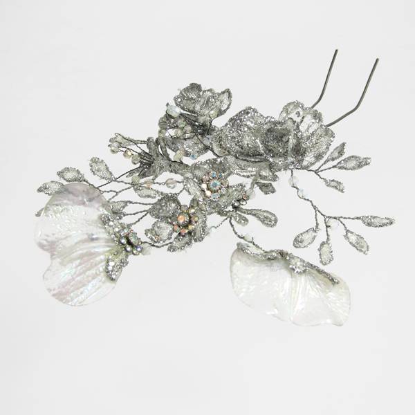A fantasy floral hairpin created with Chantilly lace, Swarovski crystals and iridescent embossed palettes in to a spray of flowers mounted on to a hairpin.