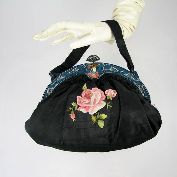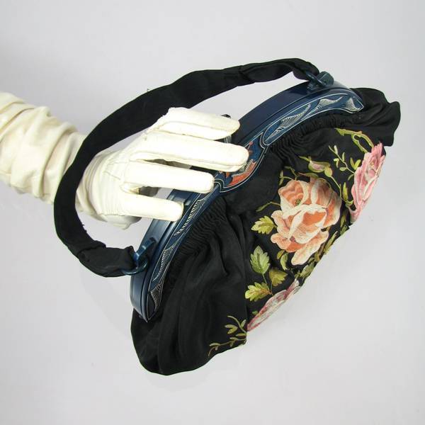French, Japanese-style Bakelite frame evening bag with chain stitch shaded embroidery of large tubor roses and foliage on faille silk. Push button opening fabulous colours.