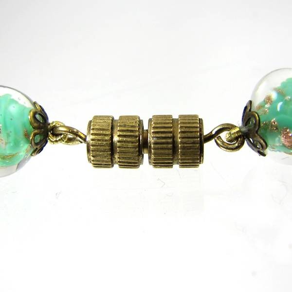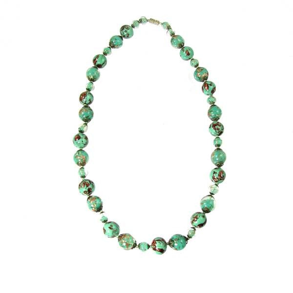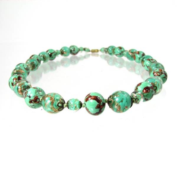 Venetian graduated jade green beads with gold spangled marble effect. Original clasp.