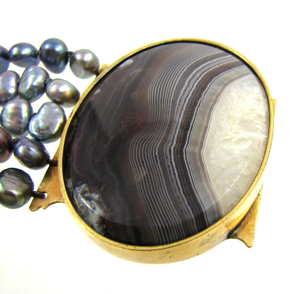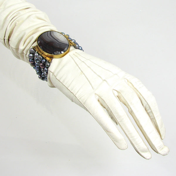 Mid-Victorian silver gilt black and white banded agate clasp with fresh water pearls adorning five lines of this bracelet.