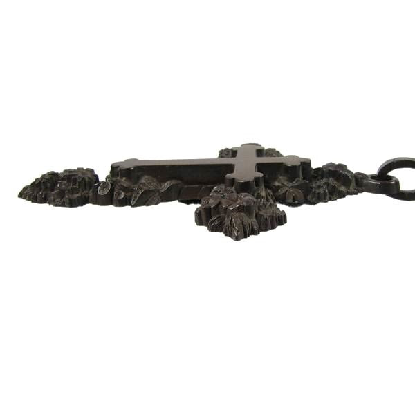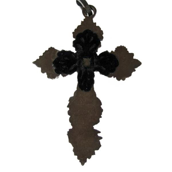 Victorian vulcanite cross circa 1880 suspended on a ribbon beaded necklace, embellished with assorted flowers on the face of the cross.