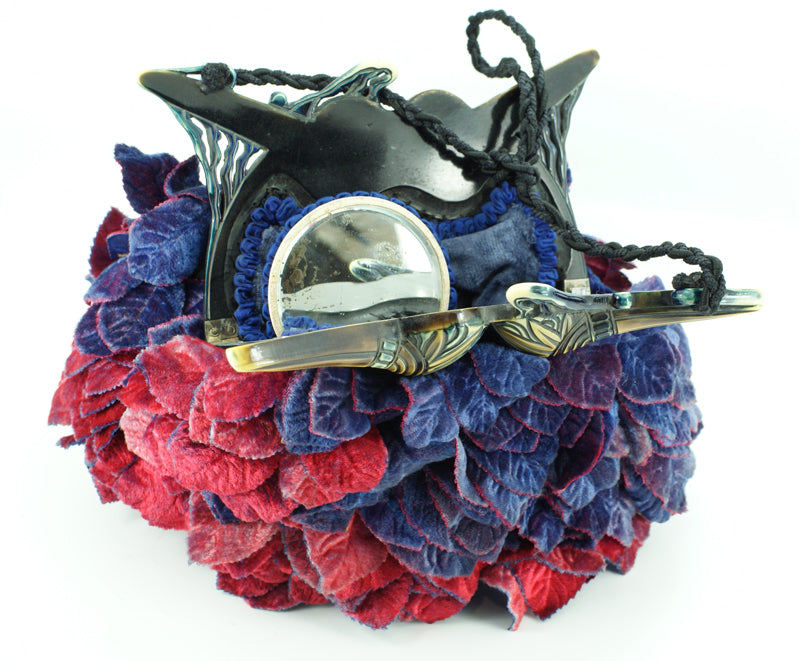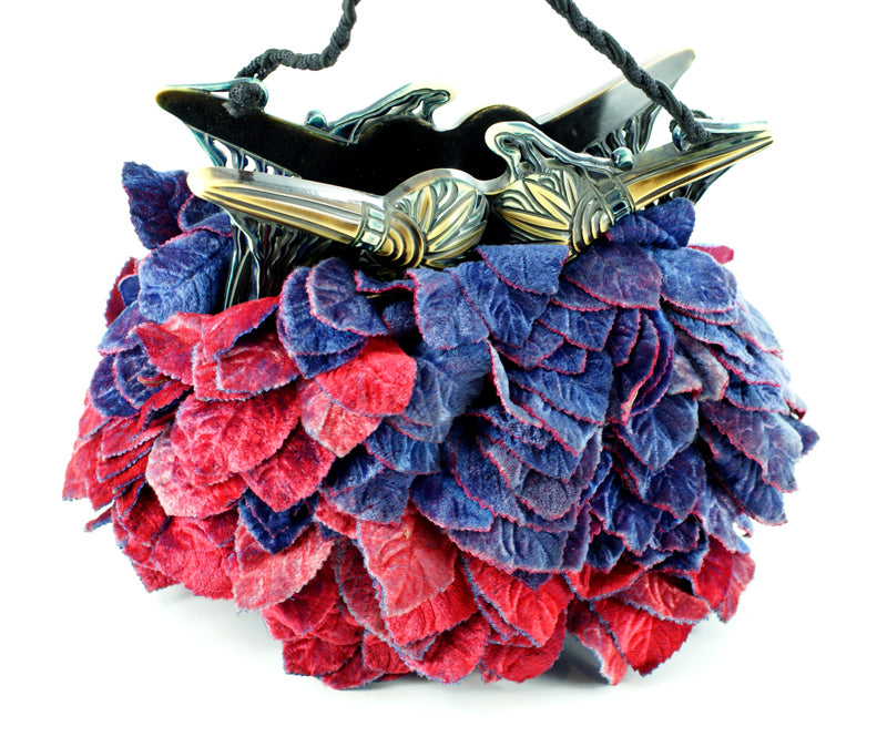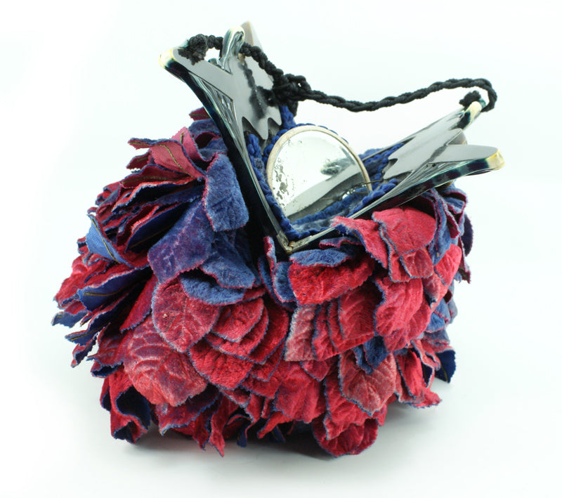 Beautifully made felt handbag featuring velvet leaves in ruby and saphire blue shades.